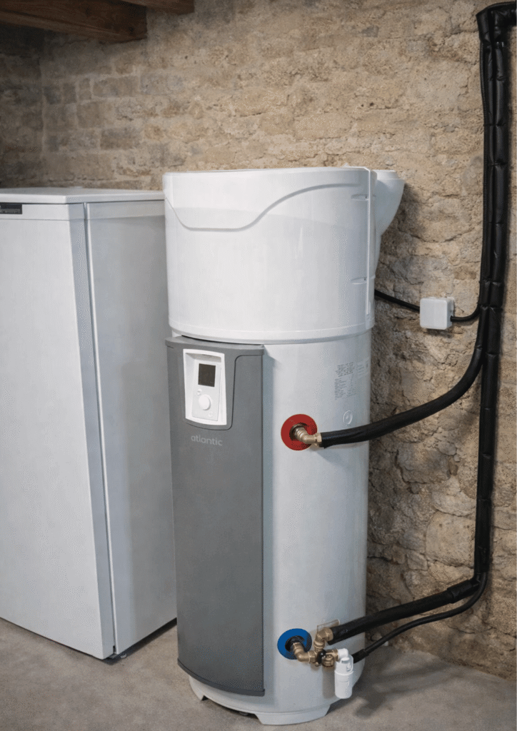 Dans une logique systémique, le ballon thermodynamique à air ambiant s’insère dans le logement : une pompe à chaleur intégrée récupère les calories de l’air intérieur (garage, buanderie, cellier) pour chauffer et stocker l’eau chaude sanitaire. La performance dépend du volume d’air et de la ventilation du local, sans unité extérieure.